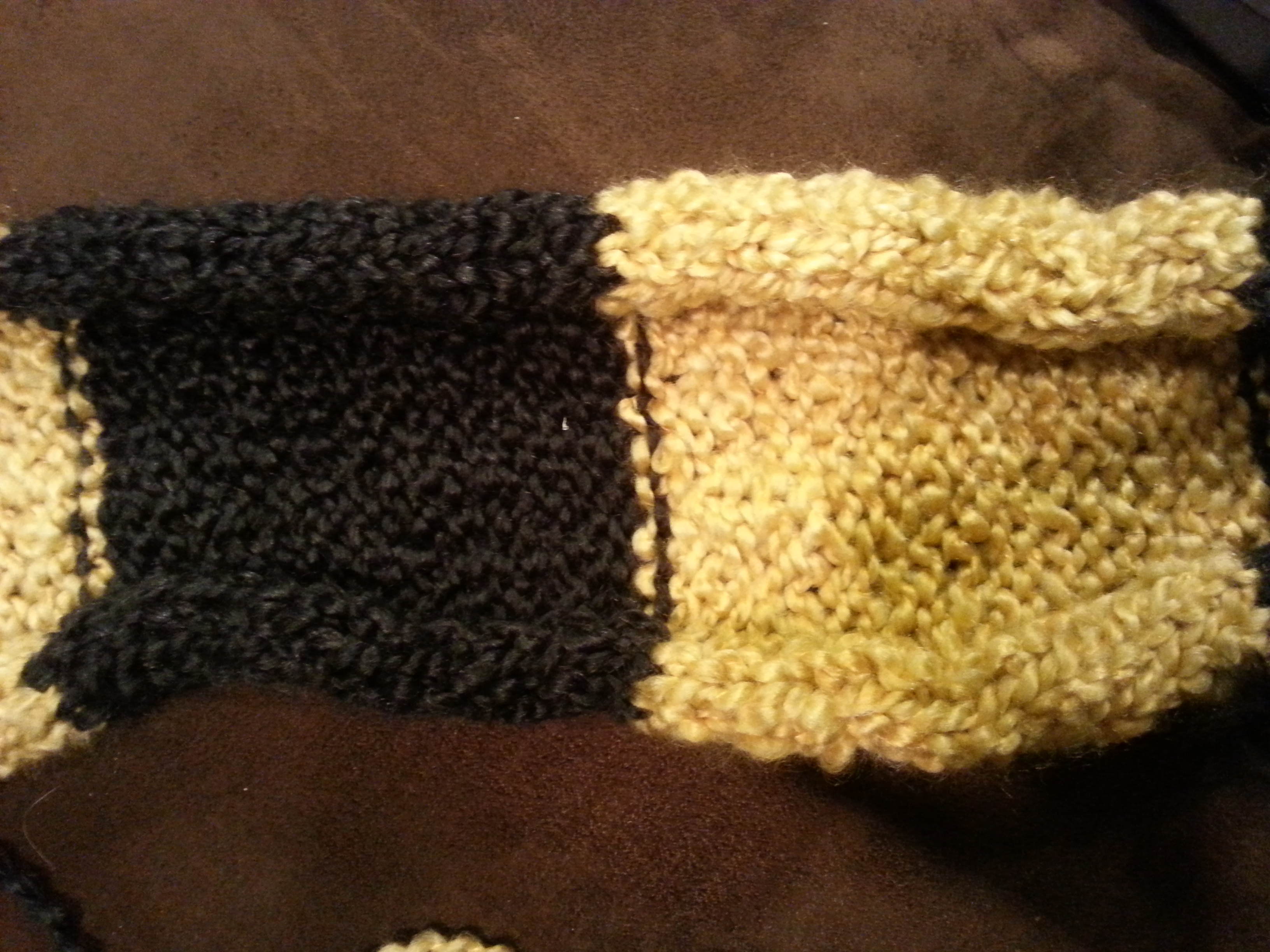 One day, when I got tired of the color I was using, I decided to switch to another. This time, I didn’t have access to the internet, so I devised my own system for stitching colors together. When one row neared the end, I cut the yarn I was using and tied it to another color. Then I kept knitting, tucking the little knot inside the next row.